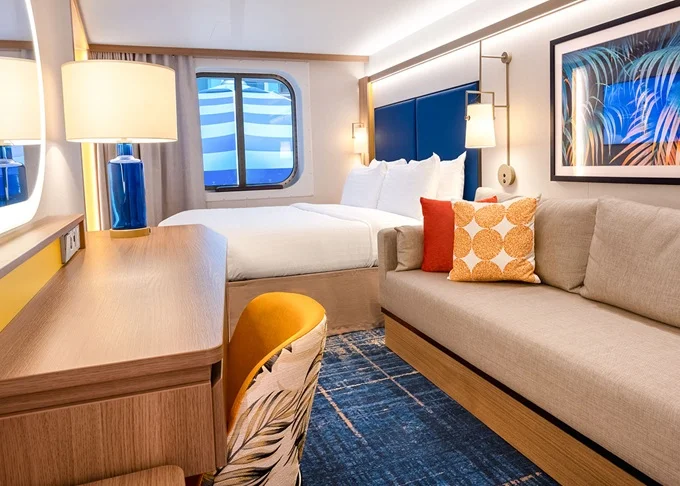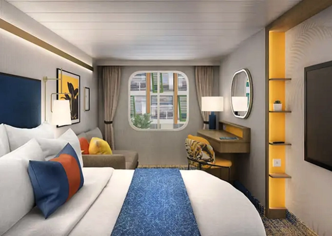 T5 - Vnútorná kajuta s oknom / Surfside Family 17 m². Neotvárateľné okno s výhľadom na štvrť Surfside. 8. paluba vpredu. Max 4 osoby. 5 361 € 1 787 € za osobu