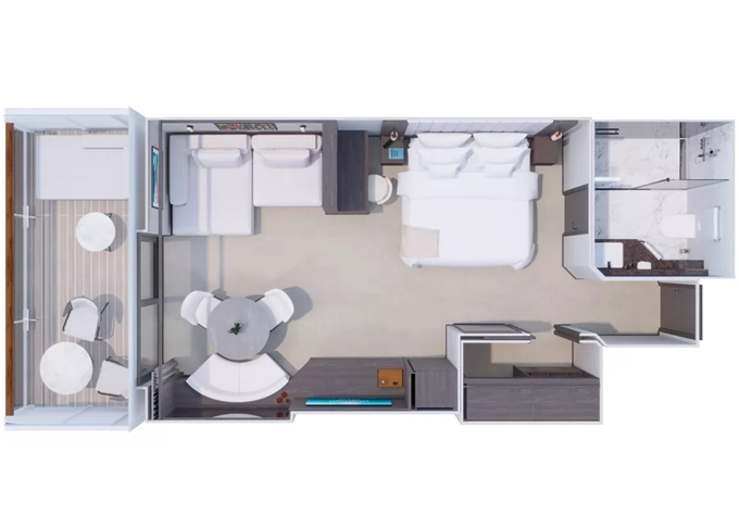 | Retreat Residence Suita 63 m² + Terasa s vírivkou a sedením 14 m² / 7. paluba: 18 m². Spálňa s obývacou a jedálenskou časťou, šatník. Koktailová súprava, minibar, kávovar, vodná kanvica, ďalekohľad, sejf, mramorová kúpeľňa s vaňou a sprchou, extra wc. Taška Technogym Case Kit. Fľaša šampanského na privítanie. Služby osobného majordóma. Maximálna kapacita 3 dospelí alebo 2 dospelí + 2 deti pod 18 rokov. | 99 412 € 24 853 € za osobu | ||