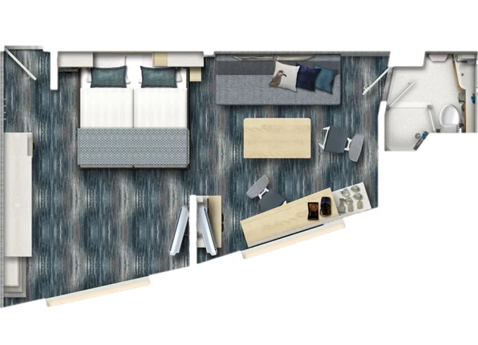 SUHO - Himmel & Meer Suite 42 m² + prekrytá terasa 29 m² na poschodí so stolom, ležadlami a s hojdacou sieťou. 14. paluba. Max 4 osoby. Výhody Suite. 19 216 € 4 804 € za osobu