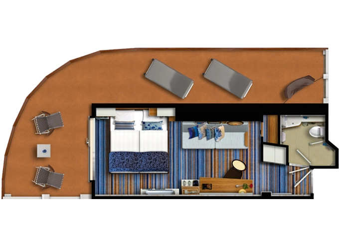 | VKPO - Kajuta s terasou Premium 17 m² + balkón 30 m² s ležadlami a hojdacou sieťou. 7-11. paluba. Max 3 osoby. | 2 878 € 2 878 € za osobu |