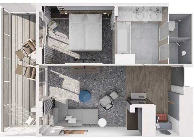 | JBAO - Junior Suite s balkónom 26 m² + balkón 7 m² so stoličkami a podnožkami. 9-14. paluba. Max 4 osoby. Výhody Junior Suite. | 11 278 € 5 639 € za osobu |