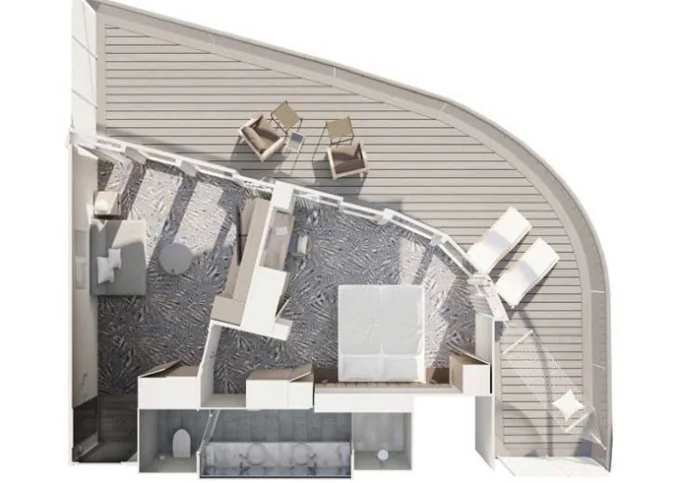 | SUGO - Große Freiheit Suite 88 m² + balkón 43 m² so stolom, ležadlami + balkón s hojdacou sieťou. 2 spálne, 2 kúpeľne, šatník, infračervená sauna. 9,10. paluba. Max 6 osoby. Výhody Suite. | 32 455 € 6 491 € za osobu | ||