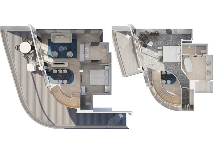 | SUGO - Große Freiheit Suite 88 m² + balkón 43 m² so stolom, ležadlami + balkón s hojdacou sieťou. 2 spálne, 2 kúpeľne, šatník, infračervená sauna. 9,10. paluba. Max 6 osoby. Výhody Suite. | 29 878 € 14 939 € za osobu | ||